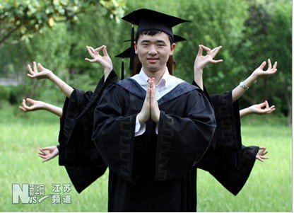 中国首批90后毕业季:毕业照玩穿越 晒遗憾显怀旧 来源:新华网 日期:2012年06月09日 记者姜春 媛陶叶 一天的实习结束了,北京某高校大四学生小张回到宿舍,打开电脑,发出一条微博:“我最遗憾的是没有上过通宵自习,没有吃过校门口的小吃……” 今年夏天,中国首批“90后”大学毕业生即将告别校园,走进社会。他们有的拍个性毕业照,有的举行另类毕业仪式,以“90后”特有的方式书写青春记忆。  资料图片:江苏省淮阴师范学院的大四毕业生在拍摄富有个性的毕业照。(陈暐摄) 毕业照讲“个性” “穿越版”“新娘版”“复古版”“恐怖版”“千手观音版”……如果你以为这是影视剧,那你就“out”了。正而八经、“清汤寡水”式的毕业照已不符合90后的“口味”。他们追求的是特立独行和个性飞扬。 武汉大学5位女生的硕士毕业照引起网友热议。照片中,女生们在武大校园中穿着中国传统新娘礼服。有网友发帖称“喜欢这种方式,喜欢这些女孩。”微博网友“@十宗罪”说:“美丽的女孩在美丽的年华嫁给了美丽的武大,真羡慕她们。” 微博上一组主题为“设计死”的毕业照最近被广泛转发。一群穿着学士服的年轻人在诡异的光线下做着张牙舞爪的动作。这组照片被网友称为“幽灵毕业照”。微博网友“@死不了活着”说,这个创意非常有意思,为自己的青春留下了独特印记。 南京一些高校近来刮起“民国风”,不少毕业生穿上上世纪一二十年代的学生制服拍毕业照,恍惚间仿佛穿越到了民国时期。还有网友上传了“美腿毕业照”“史上最‘火’毕业照”……各种奇思怪想层出不穷,用“90后”毕业生们的话来说,“只有你想不到,没有他们做不到”。 网友BNB说:“有些毕业照比较新颖,有些很雷人,比如男生穿裙子什么的,我这个年纪的人,有点接受不了。”北京一所高校教务处胡老师认为,对个性毕业照,可以本着接纳、包容的胸怀看待。 “遗憾体”走红 “逃课太多、考研没有好好复习,没有遇到喜欢的女生,没有打造良好的职业形象……”以“大学最遗憾的事”开头的毕业生“遗憾体”最近走红网络。 湖南科技大学2008级毕业生在微博上发起“讲述大学里最遗憾的事”话题,引来众多毕业生围观跟帖,纷纷“晒遗憾”:“我最遗憾的是减肥木有成功”、“我认识了很多的朋友,却没有男朋友”、“我最大的遗憾是没有去过女生宿舍”、“我遗憾的是上学期间大家都叫我男屌丝而不是高富帅”……西南某高校的同学甚至将“遗憾”写在纸上,合影留念。 回忆大学生活中的点滴趣事,看起来幽默搞笑的“遗憾”为毕业季增添了几分惆怅和忧伤。微博名为“@笨笨”的中文系毕业生对记者说,临近毕业,大家既要准备论文答辩,又要找工作。朝夕相处四年的同学即将各奔他乡,心情复杂,压力山大。“晒遗憾”既是一种自我调侃,也让大家回忆往昔的种种趣事,唤起对大学生活的不舍之情。 微博网友“@小考拉”的“遗憾”令网友动容:“如果大学可以重来,我不要再沉迷于网络,要好好学习;还要用假期带爸爸走遍祖国,吃遍美食……不要让他带着遗憾离开这个世界。” “如果时光可以重来,我一定会少留点遗憾。”即将毕业的学子们对往昔的怀念追忆令学弟学妹不免唏嘘。大三学生李晓明在微博里说:“前辈们的遗憾提醒我们珍惜大学时光,但是青春本身就是不完美、不成熟的,这些‘遗憾’也是我们人生的必修课。” 网友“@我是70后”说:“连‘90后’都开始怀旧了!勾起了‘80后’和‘70后’甚至‘60后’的青春记忆,对人生中的遗憾进行回味和感叹……” 网友“爱生活,爱健康”说:“临近毕业,总有些学生萌发创意,为自己的大学生活留下美好独特的记忆。” 福建工程学院文化传播系广告学专业大四学生张阳阳和缪宇晨偶然间萌生了搭车游西藏的想法。他们搭乘出租车、救护车甚至水泥搅拌车游历西藏,在车后座、帐篷和10元一张的铺位上体验了不一样的风景。 福建省宁德师范学院经济管理系2009级人力资源班的男生们在宿舍楼前草地上手持荧光棒围成一个大大的心形,里面用蜡烛拼出“2009人力资源”字样。他们高喊“2009级人力资源班女生,我们永远爱你们……你们都是我们心中的女神”。网友“@梦醒时分”对此发微博评论道:“大家一起学习了三年,积累了深厚的感情,这是很珍贵的记忆,毕业分离也可以不是伤感的,而是温情的。” 微博网友“@痛苦必然的”说:“当年我们‘70后’毕业时,大家在一起聚餐,在校园里大喊。‘90后’虽然和我们形式不太一样,但是所表达出的对同学的不舍、对老师的感恩和对母校的依恋都是一样的,怀念我们的青春时光,怀念校园。” 毕业仪式求另类 庄重的毕业典礼本是每年“毕业季”不可或缺的仪式。华东交通大学人文学院向毕业生家长发出邀请函,邀请他们参加毕业典礼,见证儿女穿上学士服,领取学位证的幸福时刻;有的学校毕业典礼却很新潮。中国传媒大学南广学院的学生们打算组织一场类似于电影节开幕式“走红毯”的活动,让毕业生们身着盛装走过红毯,在签字板上签名。