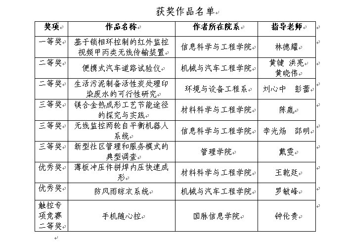 由共青团福建省委、福建省教育厅、福建省科学技术协会、福建省学生联合会主办的第十一届“挑战杯”福建省大学生课外学术科技作品竞赛决赛日前在福建农林大学举行,我校通过校内“挑战杯”课外学术科技作品竞赛推送了10件作品参加此次比赛,共获得一等奖1项、二等奖2项、三等奖3项、优秀奖2项。同时还有一作品获得宸鸿触控专项竞赛二等奖,信息科学与工程学院林德耀老师获“优秀指导教师奖”,同时我校被授予“优秀组织奖”荣誉称号。(校团委供稿,宣传部编辑)