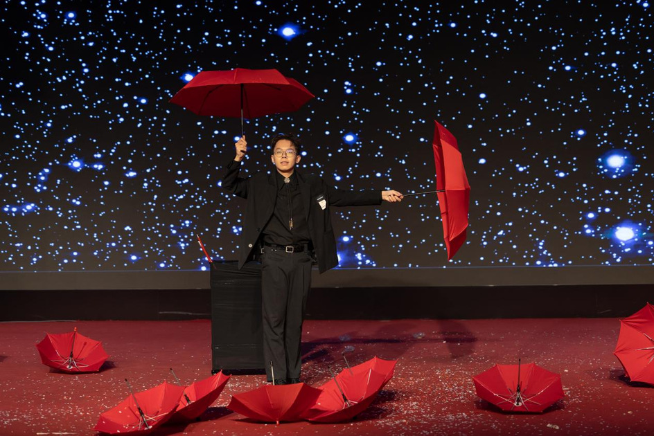 来自闽台两地的大学生轮番上阵,为师生奉上了精彩纷呈的魔术艺术盛宴,现场气氛热烈,台上台下频频互动。来自台湾的张纬、梁博翔表演魔术《超级幸运星》,第五届闽台两岸魔术大赛银奖、第七届南方六省魔术展演铜奖获得者——泉州华光学院的陈灿为大家带来了《红白幻像》,安徽职业技术学院的王健以夸张肢体语言表演的默剧《卓别林show》诙谐有趣幽默;福州职业技术学院的王铭海、高泓义用新颖的道具、独特的创意、干净利落的手法表演了《魔彩斑斓》《古彩戏法》;闽江学院的黄诗鎬带来的心灵魔术《狼人杀》,魔术师特有的角色魅力与策略深受青年学子欢迎;福建理工大学星宇魔术社的任霖广、苏凯锋和郑欣彤分别表演了《见证奇迹》《风起地》,星宇魔术社负责人吴文哲曾以最高分荣获第九届南方六省青年魔术展演近景组最佳效果奖,他带来的压轴节目《宿伞之魂》将演出推向了高潮。现场精彩表演赢得了观众们的阵阵掌声和欢呼声。