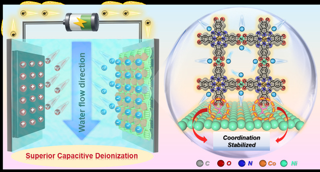 本研究设计并构筑了一种具有强界面配位作用的酞菁基导电金属有机框架(cMOF)与层状双氢氧化物(LDH)复合材料CoPc-NiO4/LDH,用于构建高效电容去离子(CDI)电极。这种复合材料充分发挥酞菁类cMOF的高电导率与可设计性,以及LDH中Ni/Co双金属的协同电化学活性,实现了电子与离子双通道的高效耦合。在界面配位条件下,羟基化酞菁配体与LDH晶格中Ni位点形成稳定的Ni-O-C配位键,诱导cMOF在LDH表面原位生长。该界面配位结构促使Co中心与Ni活性位点间产生协同电子传递,加速界面电子重排,显著降低离子扩散能垒并增强界面电导性。所得复合电极表现出优异的电化学性能:盐吸附容量高达134.7 mg g-1,吸附速率15.3 mg g-1min-1,电荷效率92%,循环稳定性94.7%。理论计算进一步证实,双金属协同与界面电子耦合是其性能提升的关键。该研究为高性能CDI电极材料的界面设计提供了新思路,在海水淡化、废水处理及资源回收等领域具有广泛应用前景。(生态环境与城市建设学院、科研处供稿)