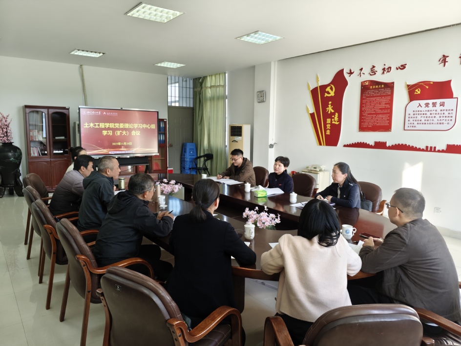 会议集中学习了党的二十届四中全会精神,土木工程学院党委书记黄志铭作了领学并进行了总结,学院院长王刚、党委委员郑莲琼分别立足岗位,结合学习心得和工作实际作了重点发言。大家表示,要深刻把握党的二十届四中全会赋予高等教育的重要使命,统筹推进教育科技人才一体发展,高质量做好学院“十五五”发展规划,在新征程上奋勇争先、夯实基础,推动学院事业发展再上新台阶。