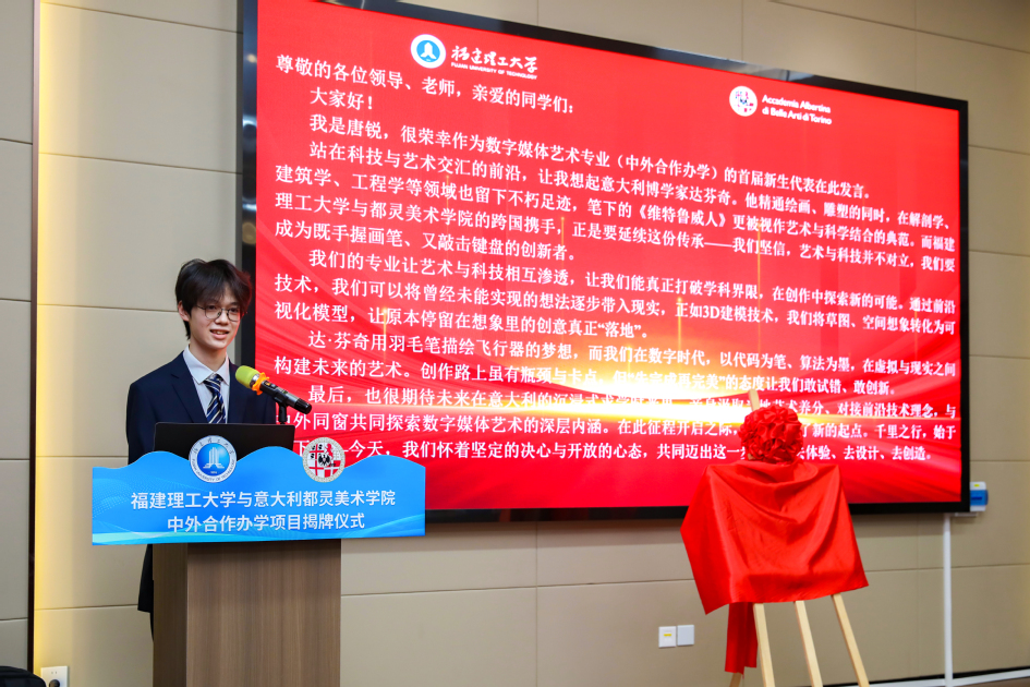 11月17日下午,福建理工大学与意大利都灵美术学院中外合作办学项目揭牌仪式在旗山校区南区举行。都灵美术学院校长Salvatore Bitonti,福建理工大学副校长吴琛出席仪式。学校机关部处、相关二级学院负责人及师生代表参加仪式。