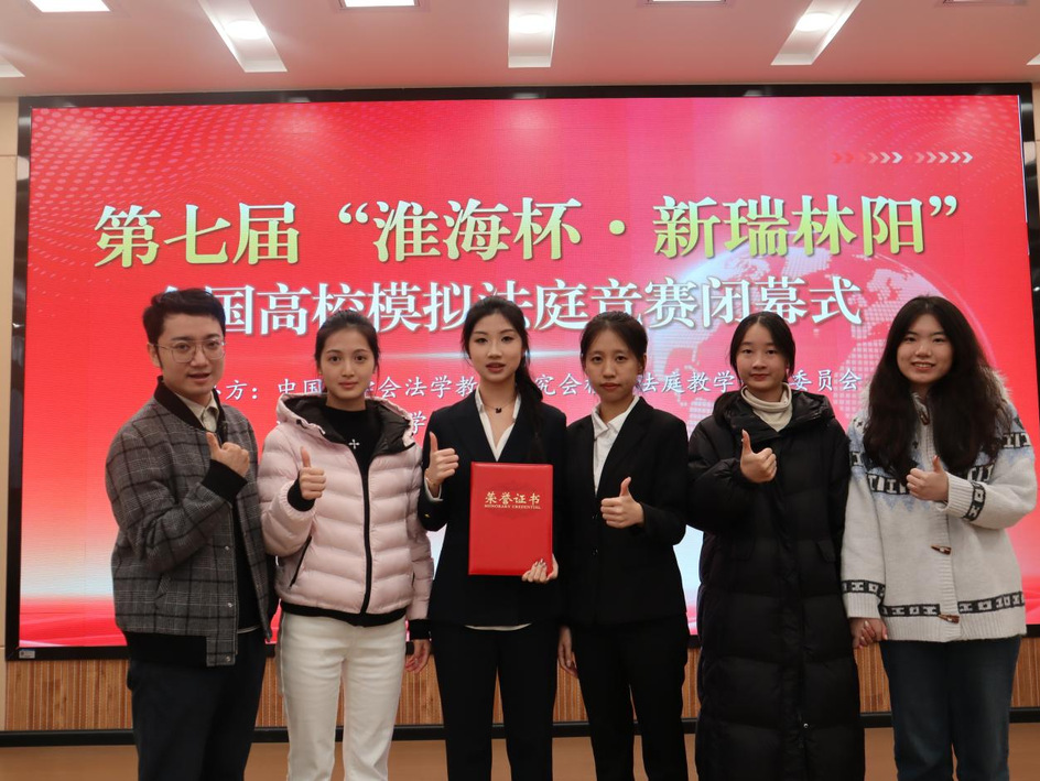 12月6日,第七届“淮海杯·新瑞林阳”全国高校模拟法庭竞赛在湖北落幕,来自中国政法大学、西南政法大学、中南财经政法大学在内的48所高校代表队参赛。我校法学院·知识产权学院模拟法庭代表队符依、王雅欣、陈雨婷、饶雅文和梁诗梦,在梁开斌、董思远、翁梦佳三位老师的指导下参赛,并凭借优异表现荣获代理人组季军,成为连续两年进入代理人组全国四强的参赛团队。
