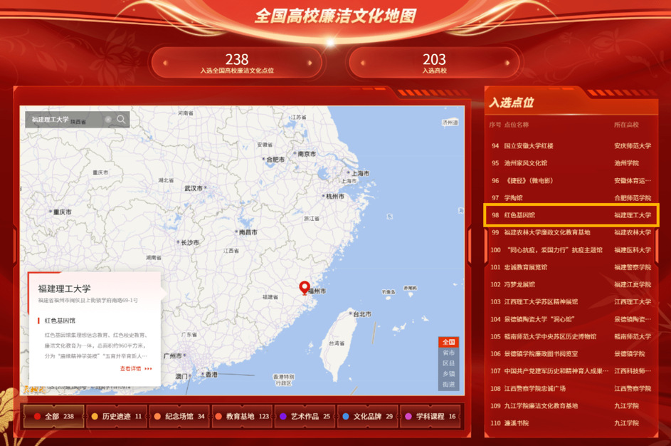 近日,教育部第十届高校廉洁教育系列活动评选结果正式公布,福建理工大学红色基因馆成功入选“传廉促担当”廉洁文化地图素材,这是我校推动廉洁文化充分融入“大思政课”建设所取得的又一重要成果。
